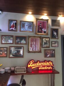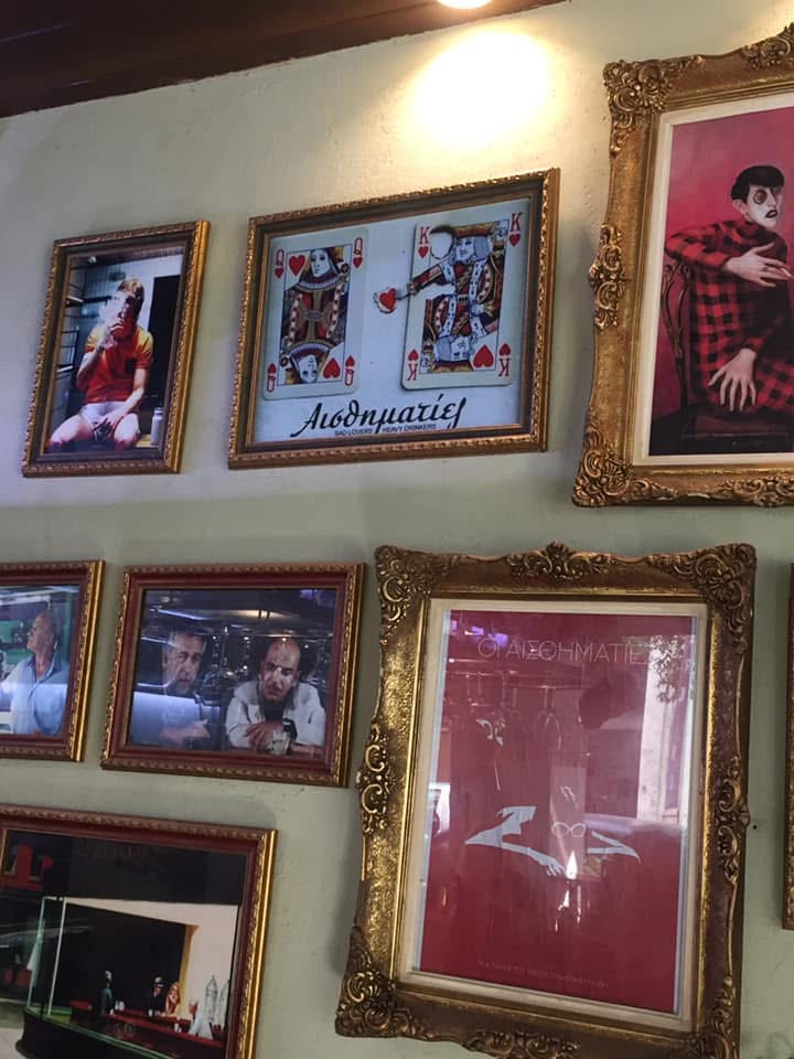 Η αφίσα από την ταινία «οι Αισθηματίες» είναι σε περίοπτη θέση στο μικρό χώρο και καδράκια με στιγμιότυπα από ταινίες κοσμούν τους τοίχους, καθώς και συλλεκτικά περιοδικά.