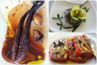 Αλλά κι από θαλασσινά δεν ξέρεις τι να πρωτοδιαλέξεις! Χταπόδι σε τρεις εκδοχές· ψητό στη σχάρα με σκορδαλιά τομάτας και φασόλια τουρσί, τηγανητό με μαγιονέζα με ζαφορά και κάπαρη και αυτό που δοκίμασα και ήταν γλύκισμα, στο φούρνο με λάδι και πετιμέζι.
