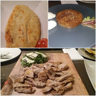 Μπορείτε να ξεκινήσετε με μια από τις πέντε σαλάτες του menu (5-6 η καθεμία)· μου φάνηκαν ενδιαφέρουσες η πράσινη με το κατσικίσιο τυρί και λιαστή τομάτα και αυτή με την bresaola, ρόκα και φλούδες παρμεζάνας.