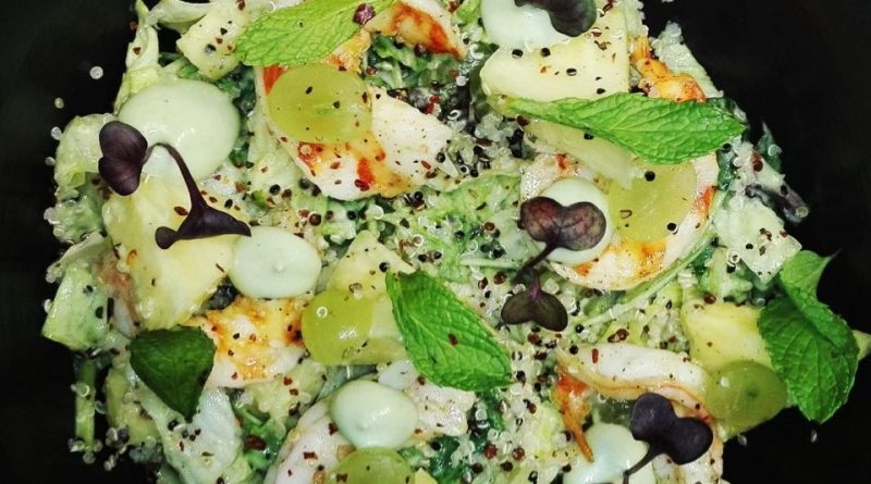 Σαλάτα με αρωματικές γαρίδες, sauce από αβοκάντο, δυόσμο, μοσχολέμονο, φρούτα και κινόα Υλικά : •Διάφορες σαλάτες του κήπου (Μαρούλια,
