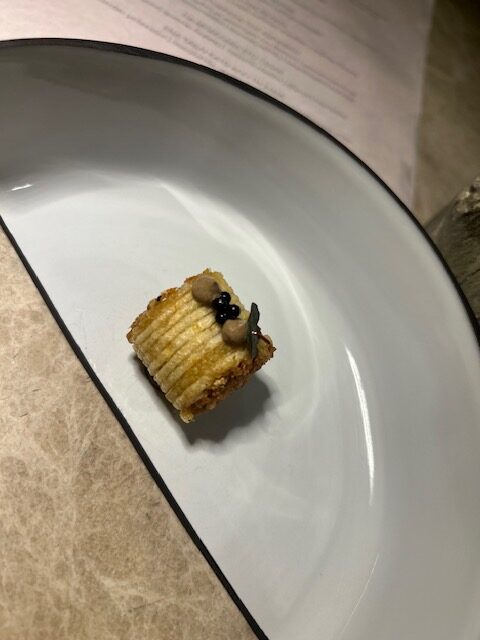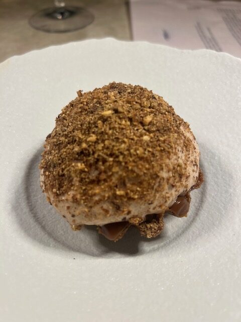 Το δεύτερο γευστικό amuse bouche, ήταν μια τραγανή μπουκιά που η γεύση της σε παρέπεμπε σε κοτόπουλο με πατάτες στο φούρνο! Και όντως μέσα σε μια crispy πέτσα από κοτόπουλο ήταν όλη η γεύση του κοτόπουλου με πατάτες… ένα από τα κλασικά Κυριακάτικα πιάτα για την οικογένεια στη χώρα μας.