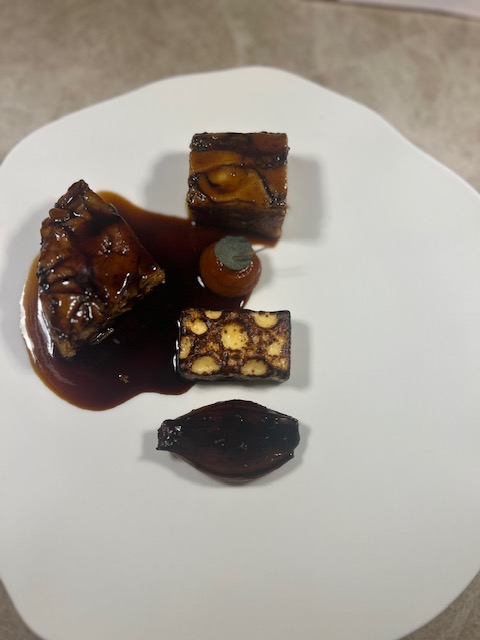 Μια μακαρονόπιτα με μπουγκατίνι και φραγκόκοτα μπρεζέ, μαγειρεμένη με σπετσερικό και δίπλα της μια πρέσα από όλα τα μέρη της φραγκόκοτας με μανιτάρια του δάσους, πελτές τομάτας (από ντόπιο παραγωγό απ’το χωριό Απολακκιά, ψημένη στα κάρβουνα), creme brulee Σαν Μιχάλη και κοκκάρι καραμελωμένο με τη σάλτσα από τη φραγκόκοτα. Ένα πολύ γευστικό πιάτο που για να το συνθέσει ο chef και η ομάδα του έχουν χρειαστεί εργατοώρες και πολύ μεράκι.