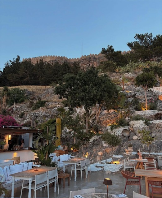 Η εμπειρία ξεκινά πριν φτάσεις στο εστιατόριο… αφού παρκάρεις στο parking λίγο πριν τον οικισμό της Λίνδου, καθώς το εστιατόριο είναι μέσα στο κάστρο, περπατάς στο πλακόστρωτο και χάνεσαι στα σοκάκια μέχρι να συναντήσεις τη μεγαλοπρεπή αψιδωτή είσοδο και να ανέβεις τα σκαλάκια που θα σε οδηγήσουν σε μια από τις ωραιότερες ταράτσες των Δωδεκανήσων.