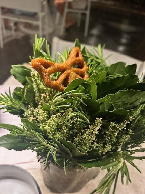 Μέσα σ’ένα μικρό τάβλι, αντί για πούλια, είχαν τοποθετηθεί δυο γλυκές μπουκιές, η μία περιείχε μελεκούνι (το τοπικό γλυκό της Ρόδου, από τον καλύτερο παραγωγό της Λίνδου) και η άλλη ήταν με φράουλα και ροζ πιπέρι. Δίπλα τους δυο εικονικά σύκα, πάνω σε φύλλα συκιάς, απολαυστικά στη γεύση όσο και στην παρουσίαση.