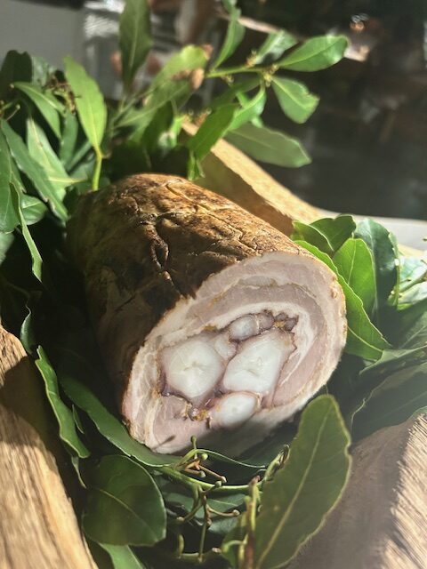 Πορκέτα γουρουνοπούλας με χταπόδι πάνω σε focaccia