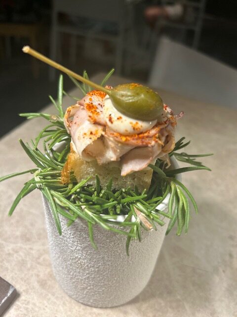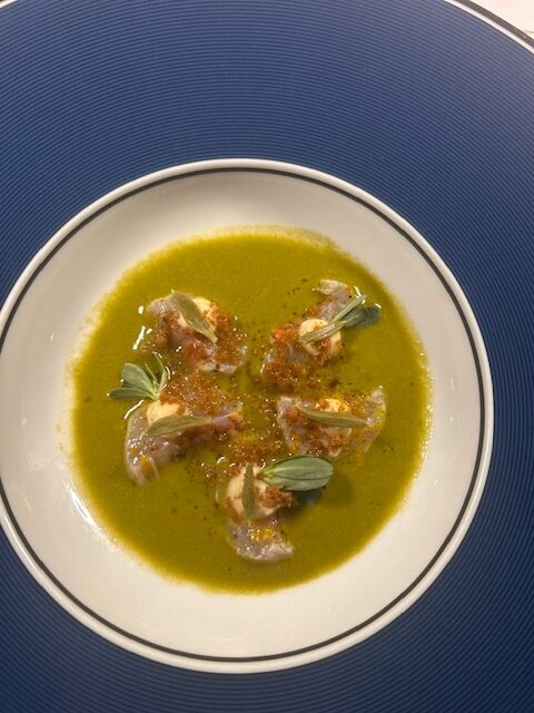 Το πρώτο πιάτο από το μενού με τον τίτλο “Στεριά και Βυθός” ήταν ένα πιάτο surf and turf, όπου ο Σταύρος Κουστένης και η ομάδα του είχαν φτιάξει μια πεντανόστιμη πορκέτα από γουρουνοπούλα, που στο κέντρο της είχε χταπόδι. Το παρουσίασαν στο τραπέζι ολόκληρο και στη συνέχεια για να το γευτώ, ήρθε το αλλαντικό ψιλοκομμένο, πανω σε ζεστή focaccia, σερβιρισμένο σε ένα μικρό γλαστράκι, με μυρωδικό που είχε αρωματίσει και την πορκέτα.