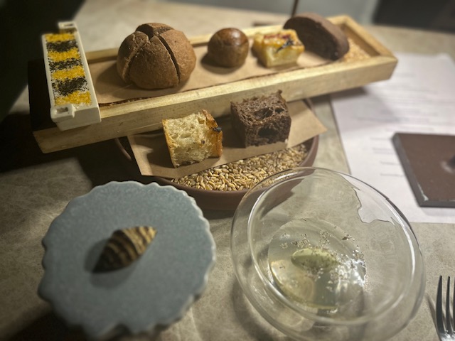 Η ποικιλία ψωμιών που ήρθε στο τραπέζι ήταν λαχταριστή! Στο μενού έφερε τον τίτλο “Άρτοι εμπνευσμένοι από το Αιγαίο και τους φούρνους που καπνίζουν ακόμη στη μνήμη“. Κι όντως κάπως έτσι ήταν… υπήρχε ακόμη και ψωμί με σύκο και μπαχαρικά. Αφράτα, ζεστά, δεν ήξερες ποιο να πρωτοδιαλέξεις, “παρέα” με ένα εξαιρετικό βούτυρο.