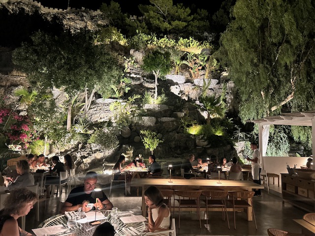 Ο χώρος με άφθονα φυτά, απλώνεται σε δυο επίπεδα, φωτισμένος όμορφα και το επάνω επίπεδο “φιλά” τα βράχια του Κάστρου της Λίνδου, τα οποία έχουν φωτίσει έτσι ώστε να δημιουργείται μια ειδυλλιακή ατμόσφαιρα.