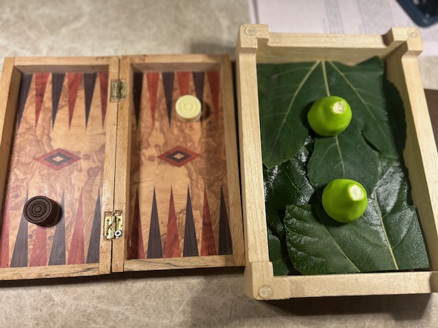 Αντί για mignardises και αφού η ώρα είχε περάσει και εγώ μονοπωλούσα την καλοσύνη του chef να μου μιλά για τα πιάτα του, καθώς τα παρουσίαζε και τα απολάμβανα, ήρθε η στιγμή να παίξουμε ένα “τάβλι κάτω από τη συκιά“.