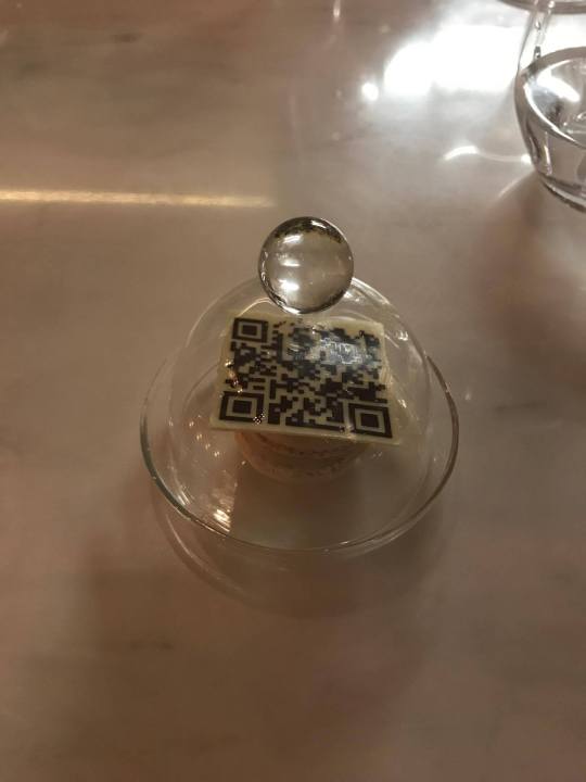 Όσο για το τέλος ήταν πολύ Hi – Tech· ένα δροσερό μακαρόν mojito με έντονη γεύση δυόσμου και πάνω σε πλάκα λευκής σοκολάτας, αποτυπωμένο τον κωδικό QR με μεταξοτυπία. Το σκάναρες με το κινητό και σου αποκάλυπτε σε PDF το μενού που μόλις είχες γευτεί! Πόσο πιο εντυπωσιακό φινάλε???