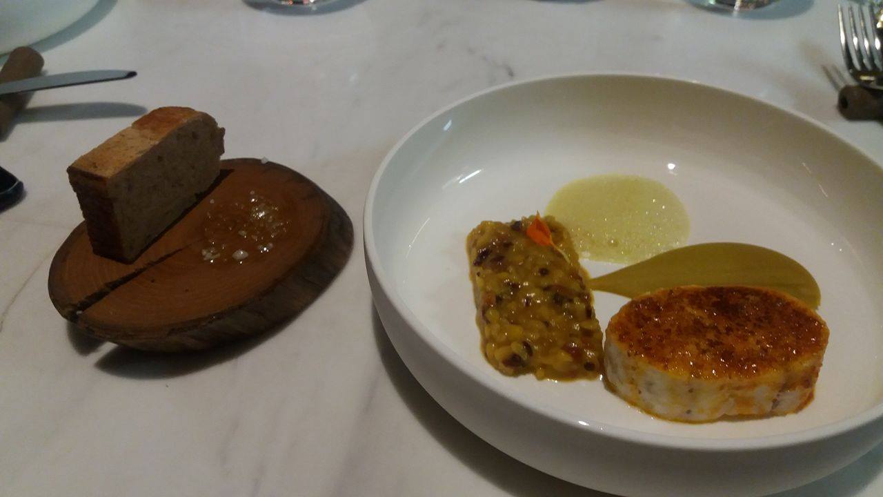 Το amuse busche ήρθε στο τραπέζι μας σε δύο ξύλινους δίσκους· ο ένας είχε ψωμί με βότανα (2 λεπτές φλοίδες σαν ρυζόχαρτο στερεωμένες σε ένα σωρό από στάρι) που συνοδεύονταν με μαγιονέζα από καμένο βούτυρο σερβιρισμένη σε ένα κατσαρολάκι μινιατούρα· ο άλλος είχε καψαλισμένο καλαμπόκι και μια μπουκιά σε μορφή καρυδιού με γέμιση ρόκα παρμεζάνα σερβιρισμένη πάνω σε ολόκληρα ακαθάριστα καρύδια. Η ιδέα, η εκτέλεση, η παρουσίαση σε προϊδέαζαν για το τι θα επακολουθήσει!