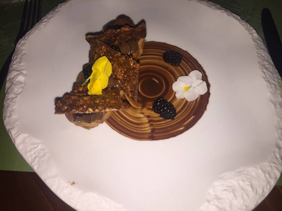 Όσο για το επιδόρπιο, μπορεί να κάνει chocoholics και μη, να ορκίζονται στο όνομά του· choux με μους πικρής σοκολάτας, βατόμουρο και κροκάν φουντουκιού.