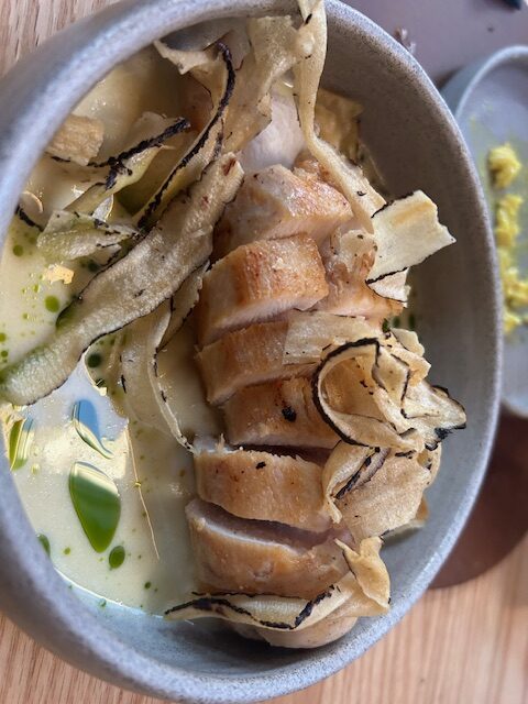 Ξεκινήστε με ένα ceviche λαβράκι ή ένα tartare μόσχου με γραβιέρα και εσαλότ, συνεχίστε με dumplings με κουνέλι και ολοκληρώστε το δείπνο με κοτόπουλο με λαγόχορτο και τρούφα ή μια πορκέτα με σπανάκι.